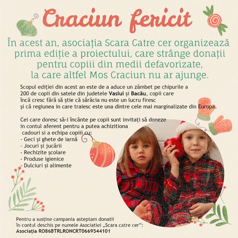 În acest an, asociația Scara Catre Cer organizează prima ediție a proiectului, care strânge donații pentru copiii din medii defavorizate, la care altfel Mos Craciun nu ar ajunge.